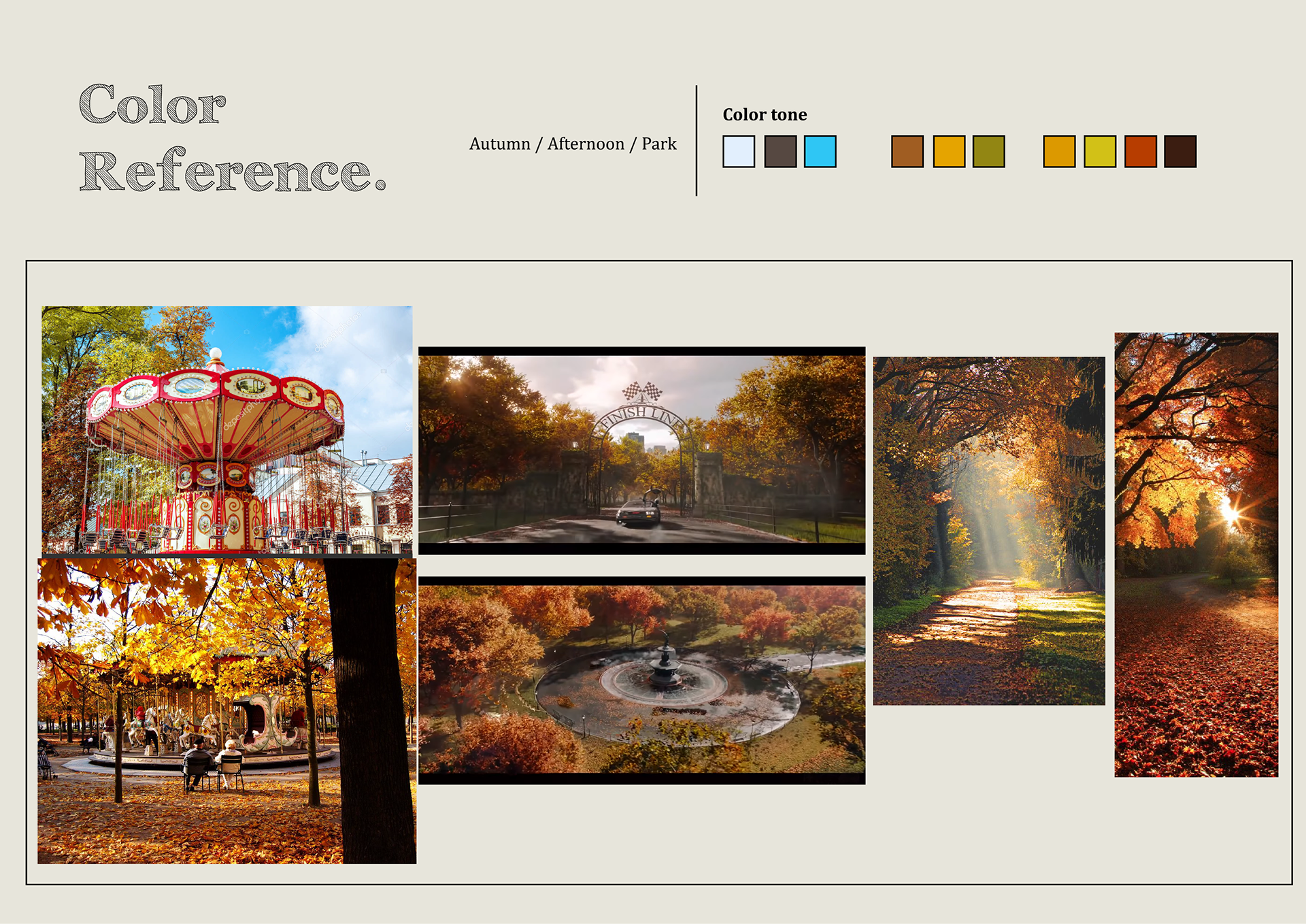 For this project I was inspired by Ready Player One (2018) - The first key scene. I wanted to create a scene which displays a post-rain environment in a park after the sun comes out during the autumn season. When looking at this image you can feel as though there is cold and crisp autumn breeze blowing through the vacant park.